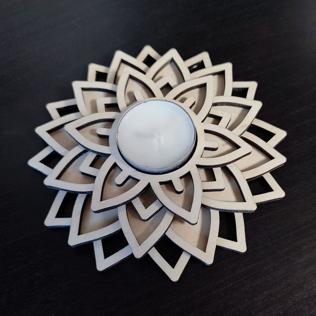 Jemný dřevěný svícen ve tvaru květiny, určený na takzvanou čajovou svíčku.